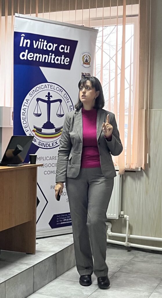 Participanții au beneficiat de prezentări susținute de formatori specializați în domenii esențiale pentru activitatea sindicală: Polina Fisticanu, șefa Departamentului protecție social-economică al CNSM, care a abordat tema „Protecția social-economică a salariaților” și Irina Ciudin, consultant superior în cadrul Departamentului juridic al CNSM, care a vorbit despre „Noile modificări operate în Codul muncii pentru anii 2024–2025”.