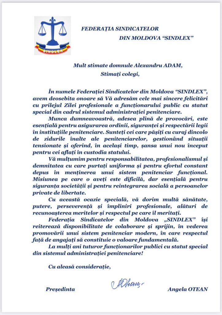 sindlex.md > Noutăți FSM > Mesaj de Felicitare cu prilejul zilei funcționarului public cu statut special din cadrul sistemului administrației penitenciare