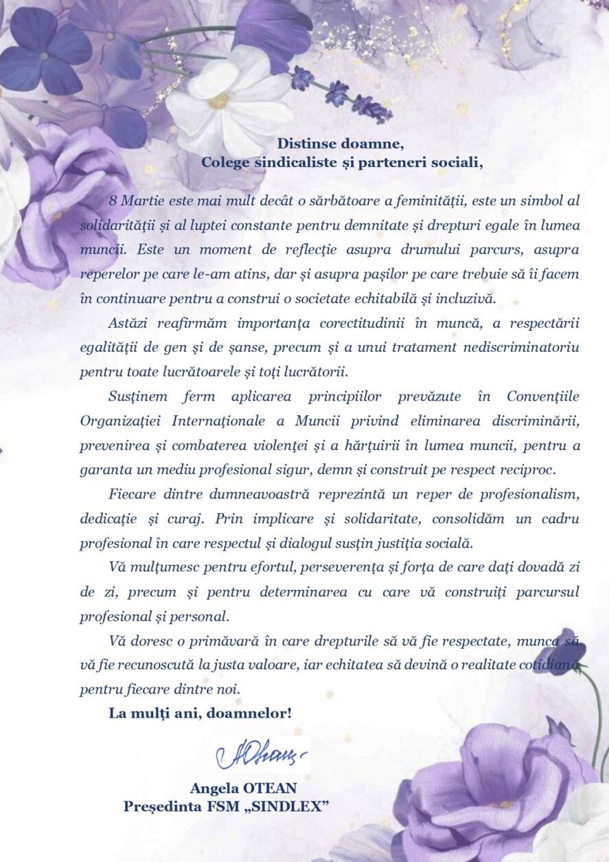 sindlex.md > Noutăți FSM > Mesajul de felicitare al președintei, Angela Otean, dedicat Zilei Internaționale a Femeii